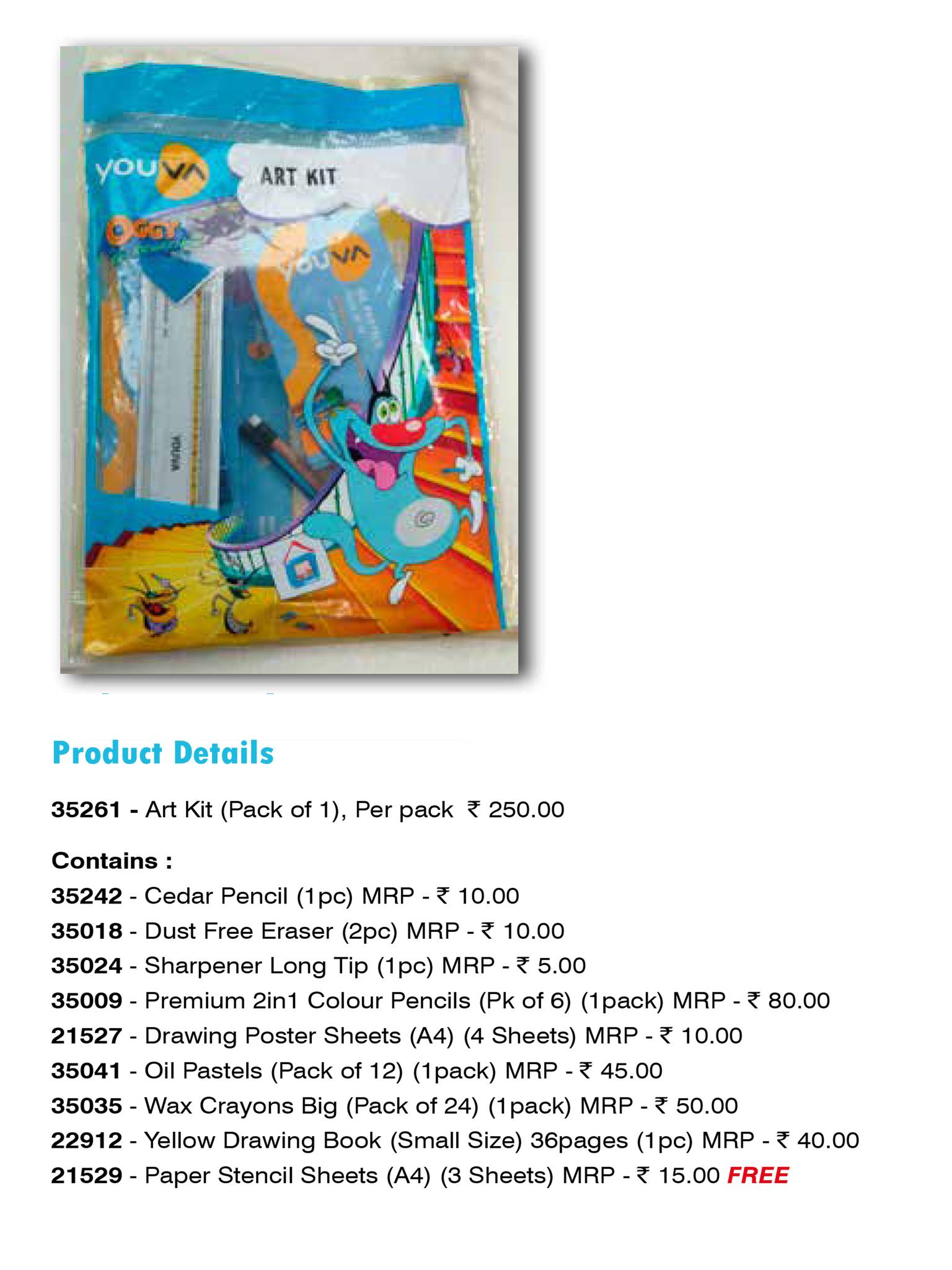 - It is also packed with A4 Drawing Book, Cedar Pencil, Eraser & Sharpener.