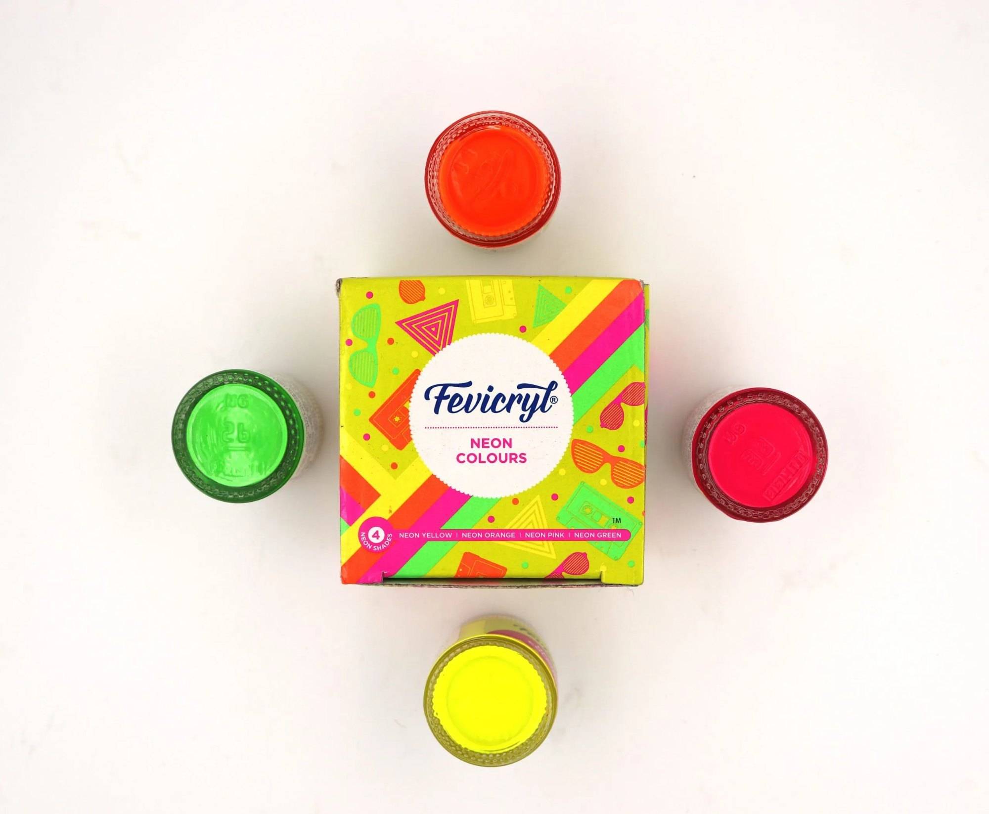 Fevicryl Neon Acrylic Colours - come in 4 vibrant shades - Neon Yellow, Neon Orange, Neon Pink, Neon Green- These colours can be used on wood, MDF, glass, terracotta, metal, fabric etc- A white base is recommended on dark surfaces before application of Neon Acrylic Colours- If thinner colour is required, add water and mix thoroughly- Remove starch from the fabric before painting- Iron fabric from the reverse side after 24 hours- Shake well before use- Non-toxic - conforms to EN 71-3 European Standards