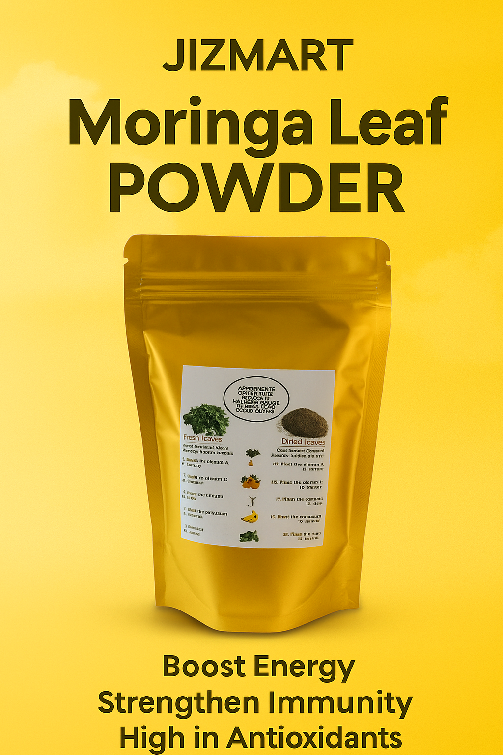 Moringa Leaf Powder is a natural superfood packed with essential vitamins, minerals, and antioxidants to support your daily wellness. Made from 100% pure, premium-quality moringa leaves, it helps boost energy, strengthen immunity, and promote healthy skin, hair, and digestion. Rich in calcium, iron, and plant-based nutrients, this vegan and chemical-free powder is a perfect addition to your smoothies, teas, or meals. Choose Jizmart for purity, quality, and the trusted goodness of nature in every scoop “Pure Nutrition, Straight from Nature